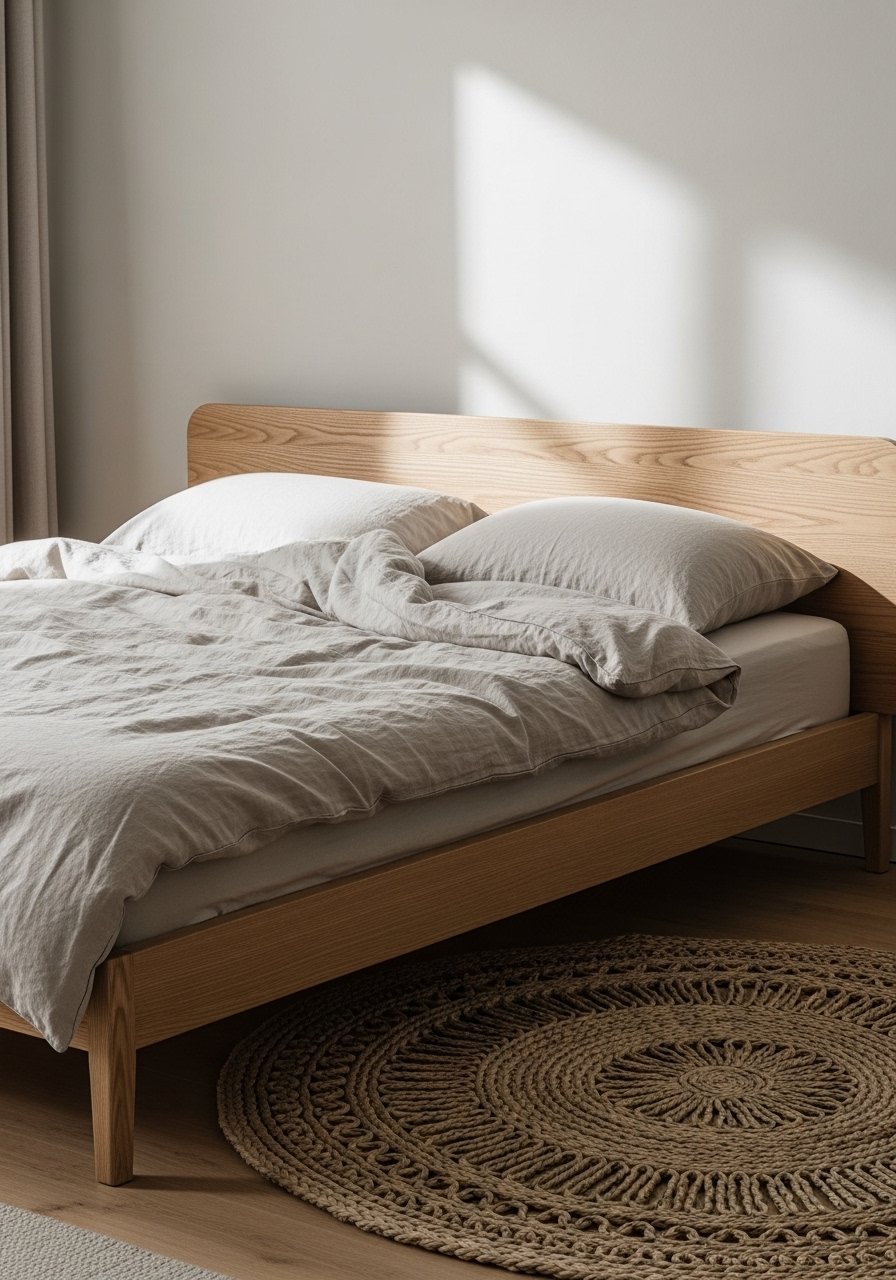 I chose a low-profile pale oak bed frame to keep the room airy and grounded. Light wood reflects more light and avoids visual heaviness. I recommend white oak bed frames with simple legs. Avoid very dark frames in small rooms—they can chop the space. This frame felt modern and simple, and it made the room read larger while still feeling cozy.