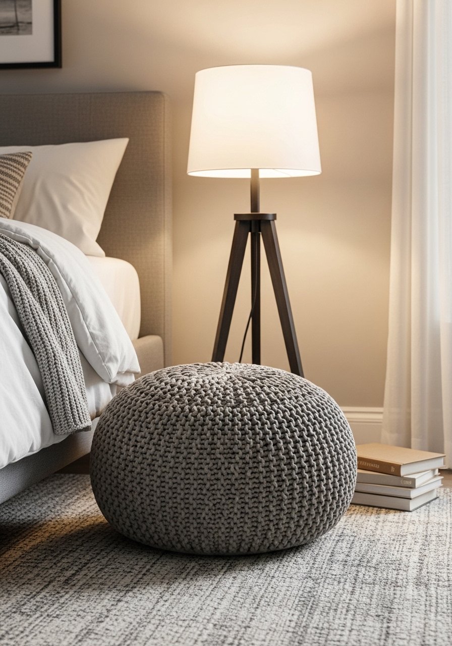 A small knit pouf offers soft seating without visual bulk. I placed one near a bedside lamp for reading and shoe changes. Cream knit poufs add texture and are easy to move. Avoid oversized chairs that crowd a small room. The pouf keeps the corner casual and usable while staying within the soft neutral palette that helps me relax.