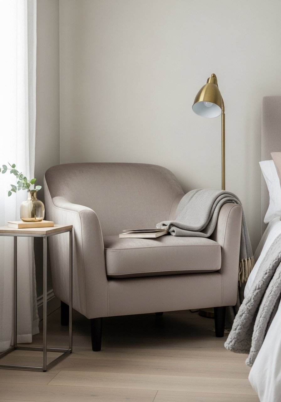 I added a plush neutral velvet accent chair in the corner to create a soft reading nook. Velvet in muted greige feels luxe without being flashy. I use a small neutral velvet accent chair. Avoid oversized chairs that dominate the room. This seat became my go-to place for pre-bed reading and lowered the temptation to scroll in bed, which improved my nighttime routine.