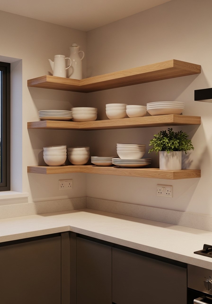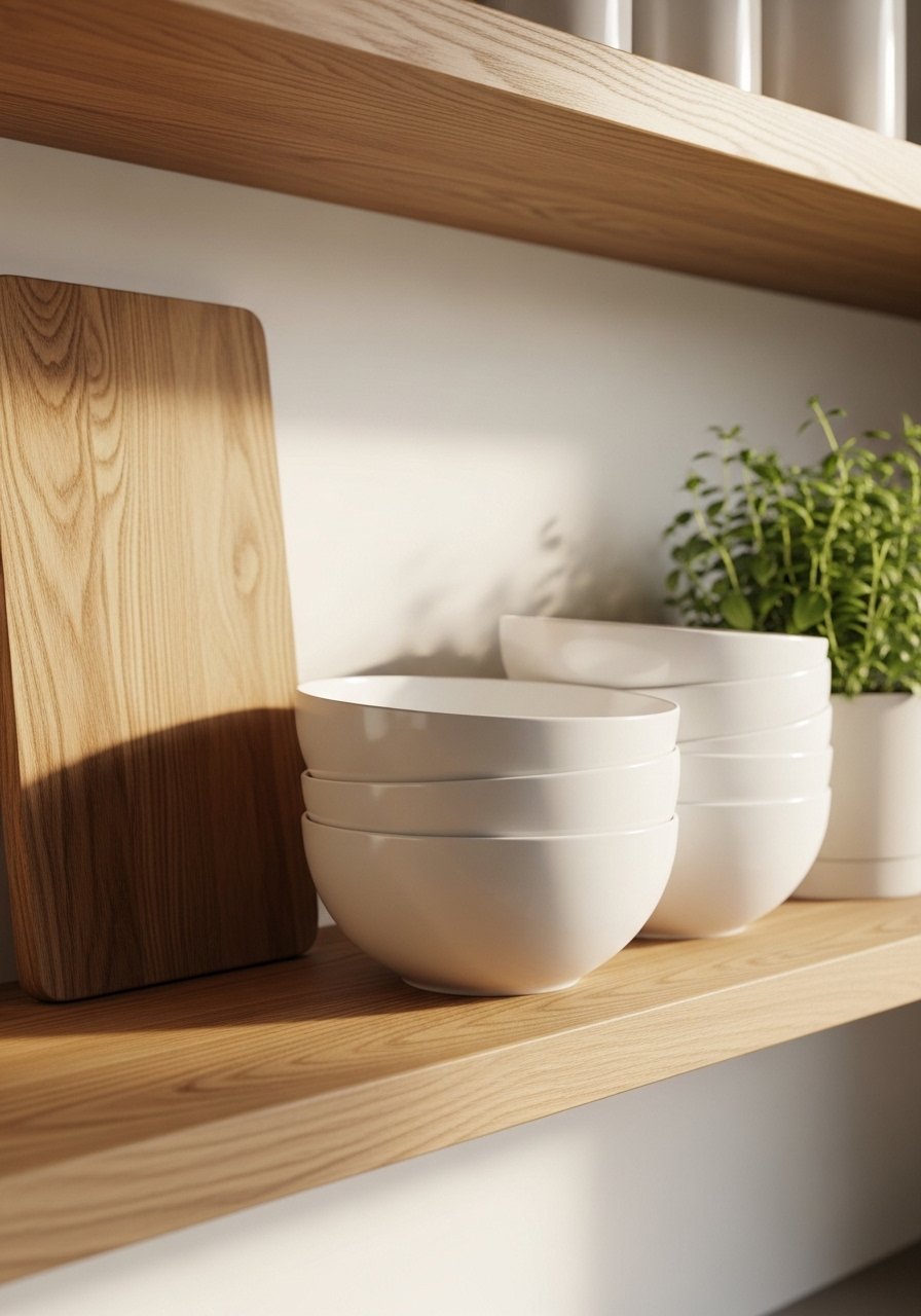 I keep seeing white oak shelves in every feed I follow. Open shelving is about edit, not excess. Use odd numbers when grouping items, three bowls, five plates. In photos this looks airy. In real kitchens dust gathers and clutter accumulates. My trick was to mix thrifted ceramics with one matching set to ground the shelves. Grab white ceramic mixing bowls and display three. Avoid using too many small pieces. They make shelves read busy in a tiny space.