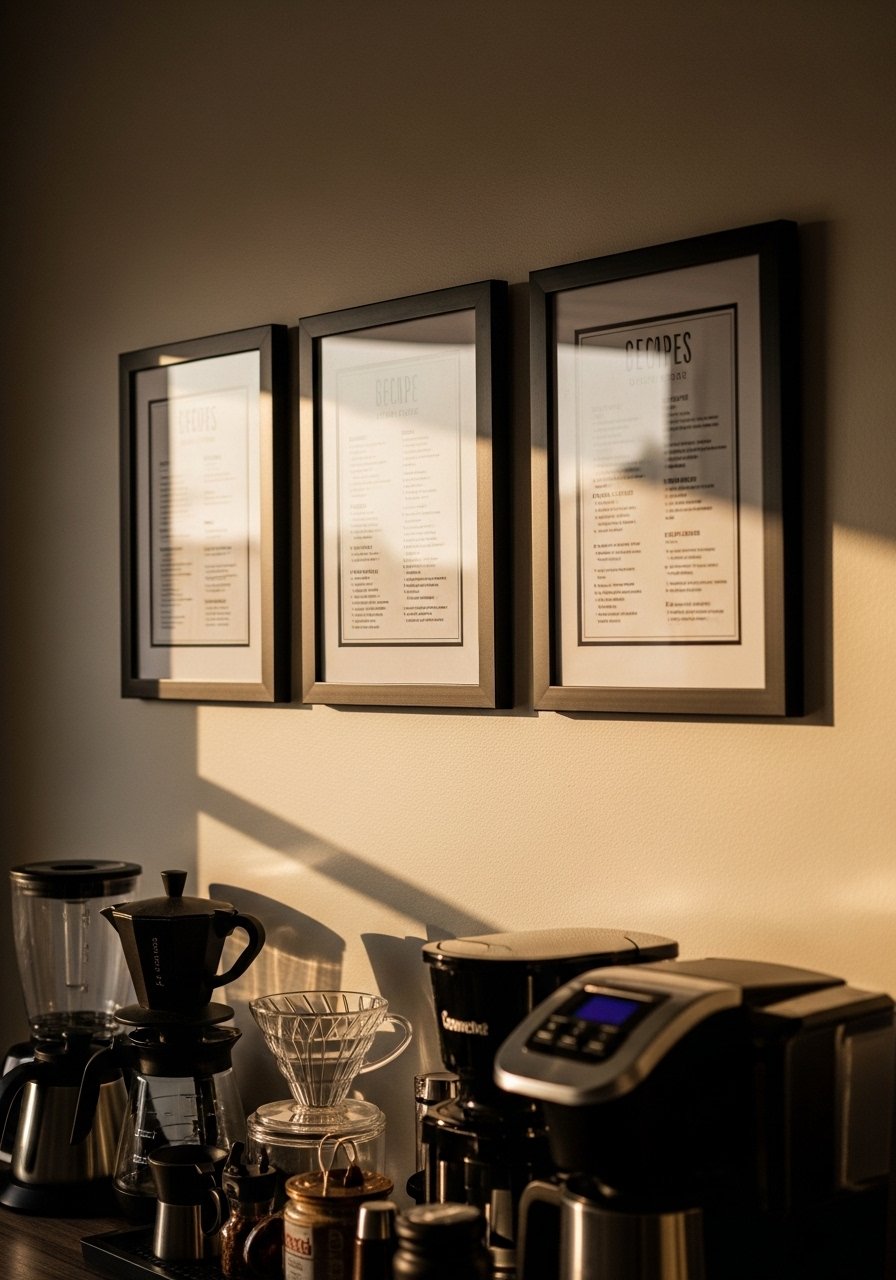 Neutral Gallery Wall with Recipe Prints Near the Coffee Station