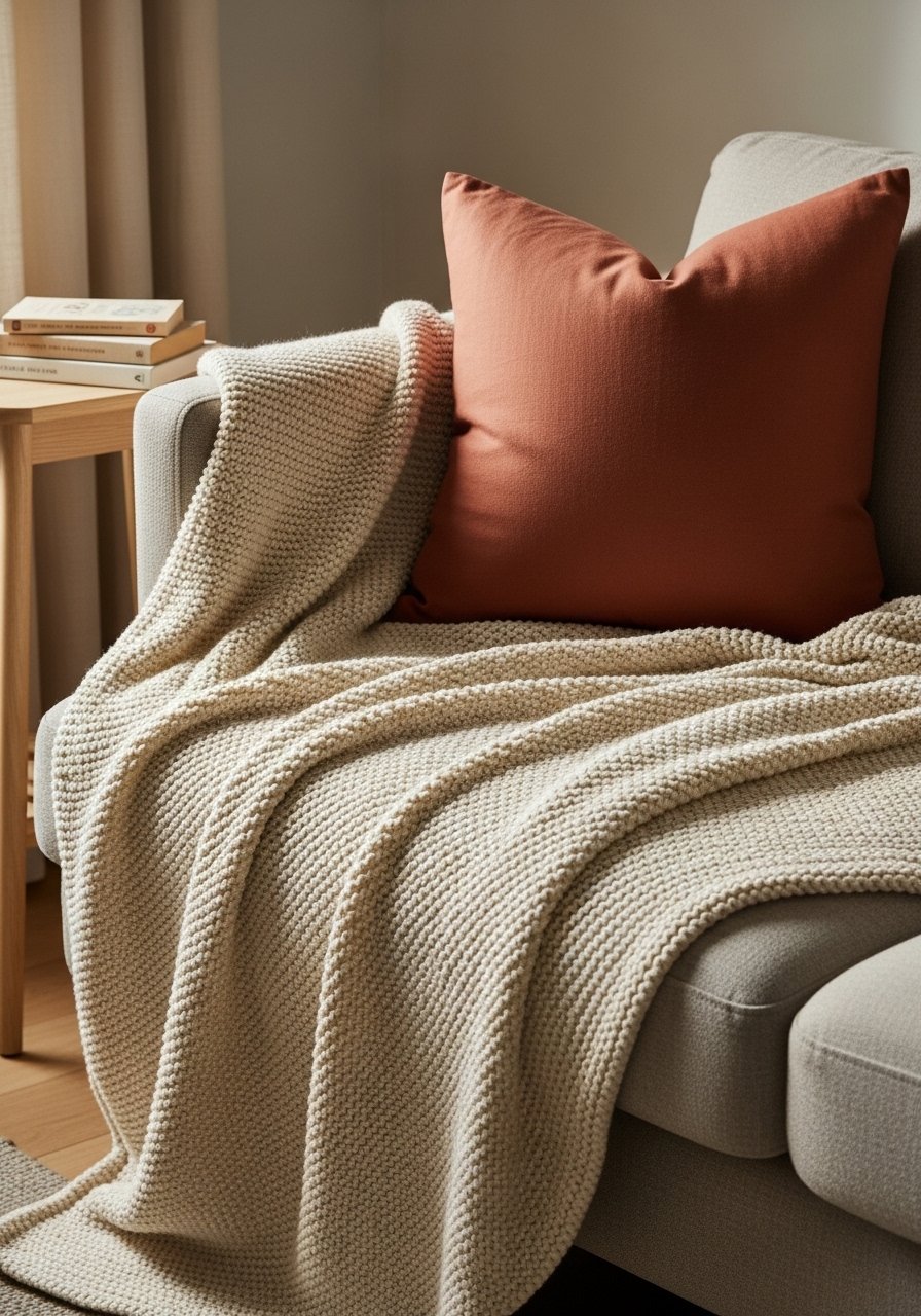 Layering shades of greige, warm beige, and soft white gives depth without fuss. I added a single terracotta pillow to anchor the palette and it read as intentional, not loud. I used this cream chunky knit throw and a 20×20 terracotta pillow from a local shop. Avoid using too many accents; one bold warm color keeps the calm, while odd-numbered pillow groups (three) feel balanced and relaxed.