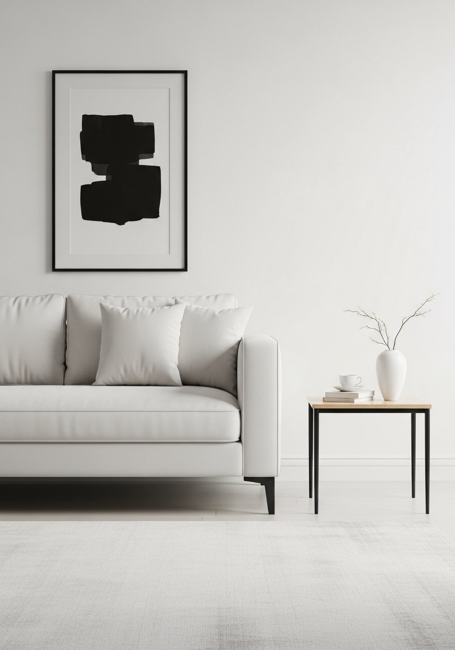I love a mostly white-and-wood room with a few black accents to sharpen the eye. Swap heavy patterns for texture: wool throw, linen cushion, and a slim black lamp. I used these black metal picture frames and a slim black floor lamp from IKEA. Mistake to avoid: too many black pieces make a neutral scheme read cold—limit black to 2–3 anchor points for visual rhythm.