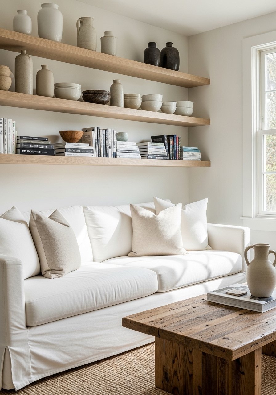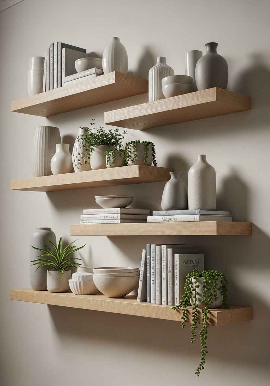 Floating shelves are perfect for bringing texture without clutter. I used white oak floating shelves and styled them with three ceramics and two plants. Mistake to avoid: overcrowding shelves—use negative space and stagger heights. Shelves also solve storage-and-style pain points by hiding cables and showing curated items neatly.