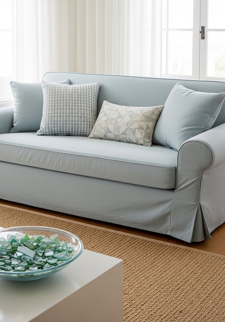 For a coastal neutral, think cool greige, driftwood, and pale sea-glass hints. I layered linen curtains and a soft gray slipcover, then added a small bowl of glass accents. Use linen blend curtains, 84-inch to keep airiness. Mistake to avoid: literal seaside kitsch. Steer clear of obvious themed items; subtle glass and weathered wood read calm and collected.