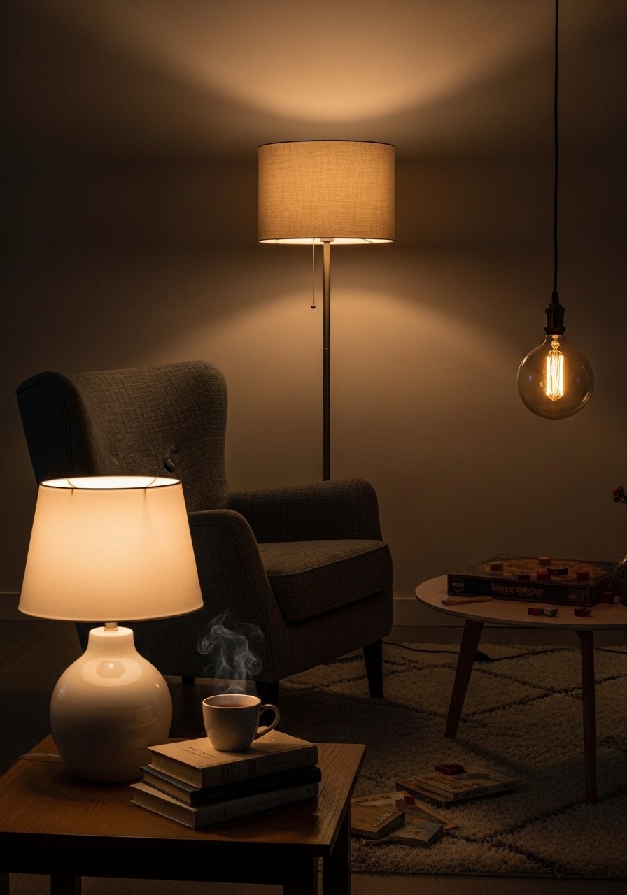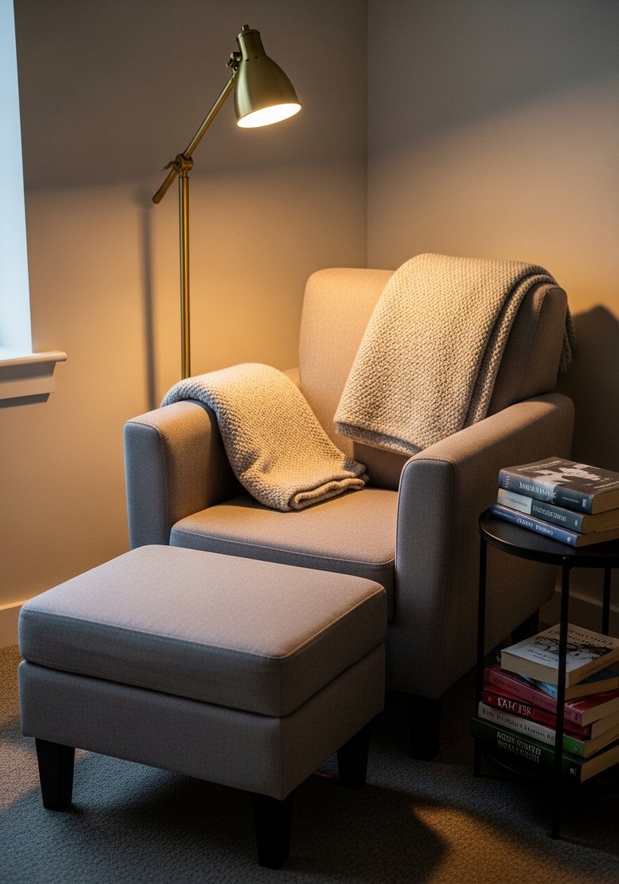 Create a small oasis with a plush 28-inch armchair, an ottoman for kicks, and warm lighting. I paired this cream chunky knit throw with a 24-inch ottoman from Target. Mistake to avoid: wrong-scale lighting—overhead glare kills the mood. Use a layered lamp with warm bulbs and a dimmer for the right reading glow.