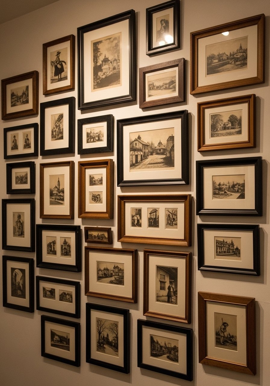 A calming gallery wall can be monochrome in sepia and white mats. I thrifted frames then bought white picture mats, 11×14 to unify the collection. Avoid splattering frames randomly; plan a center line and use odd-numbered groupings. The result reads intentional and soft, not chaotic. This approach solves the common problem of a wall that feels unfinished.