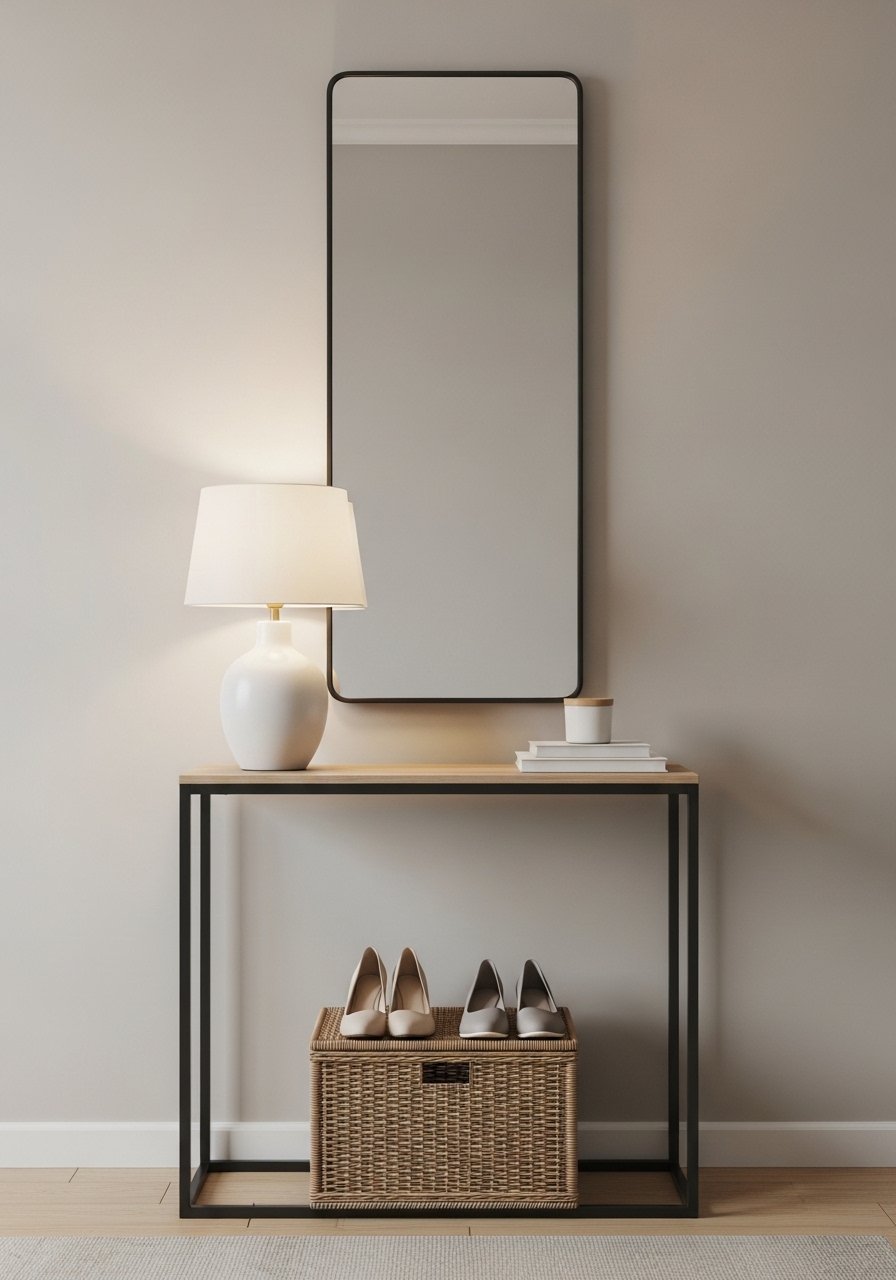 If your living room opens to an entry, create a calm transition with a slim console, a mirror, and low baskets for everyday items. I used a 36-inch round mirror and a narrow 30-inch console to keep scale right. I paired it with this 36-inch round mirror. Mistake: stuffing the area with bulky furniture. Keep it slim to maintain flow and a soft neutral welcome.