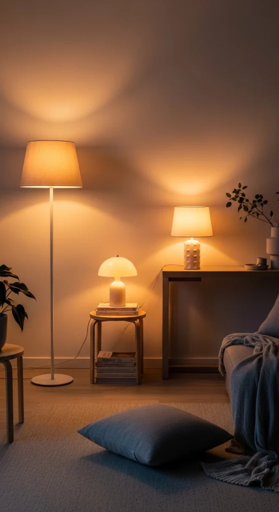 Mix floor lamps, table lamps, and wall lights. Keep bulb tones warm and soft.