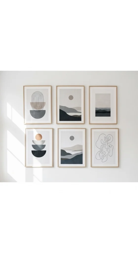 Art should support the space, not dominate it. Choose simple prints or photographs with light tones.