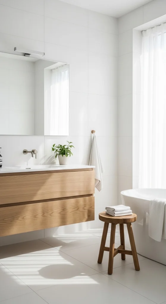 Scandinavian bathrooms rely on simplicity. White tiles and light wood accents work well together.