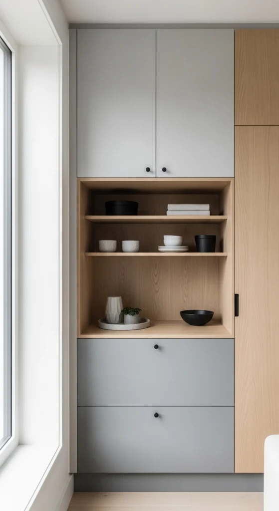 Closed storage keeps rooms calm. Open storage works only when styled carefully.