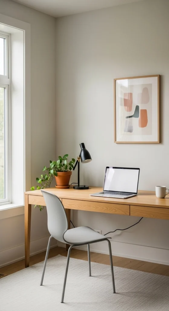Home offices benefit from calm design. Choose light desks and minimal storage.