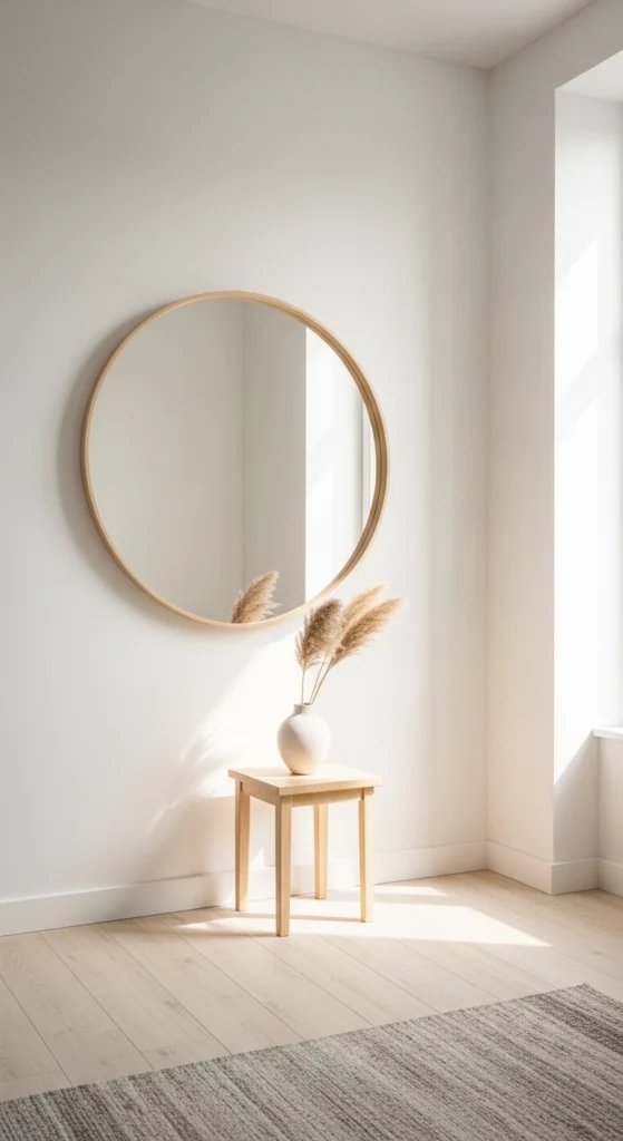 Wood brings warmth without adding clutter. Use it sparingly. Shelves, trays, or frames are enough to balance out light walls.