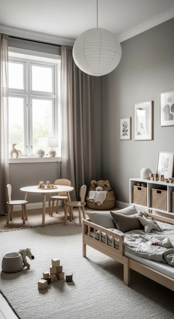 Children’s rooms can stay calm without feeling boring. Use soft colors and simple storage.
