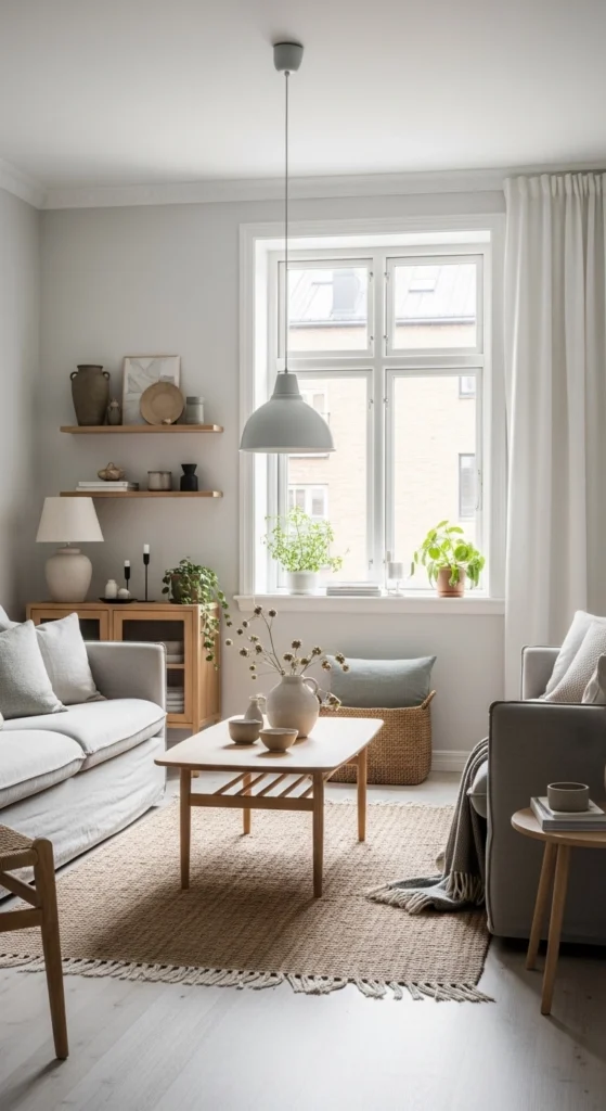 Lighting shapes mood more than decor. Scandinavian spaces use several small light sources instead of one bright ceiling fixture.