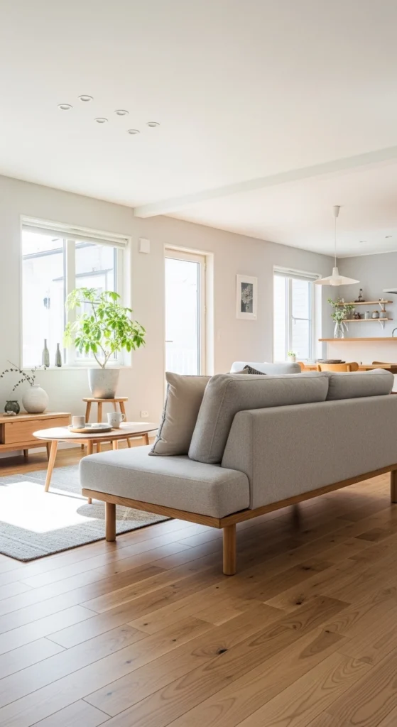 Light wood floors help bounce daylight across a room. Oak, pine, or birch finishes feel natural and relaxed. Dark floors absorb light and make rooms feel smaller, which works against the airy look.