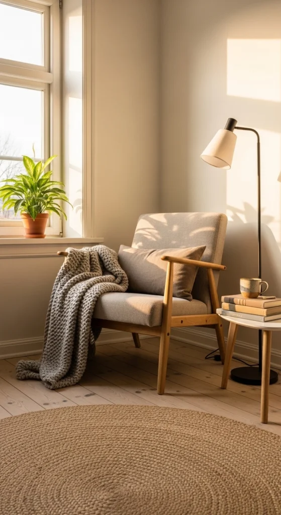Hygge is about everyday comfort. A small corner with a chair, throw, and soft light is all you need. This does not require a full room makeover.