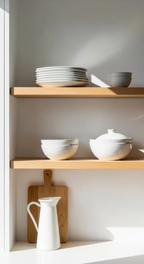 Open shelves work when styled simply. Stick to everyday items in neutral colors. White dishes, glass jars, and ceramics feel clean and practical.