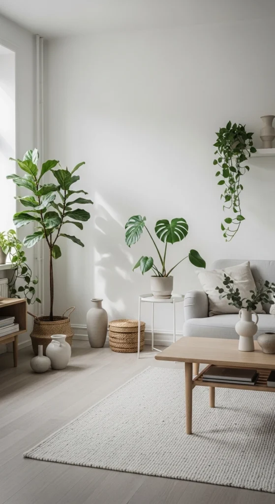 Plants add life without disrupting calm interiors. Choose plants with simple shapes and soft green tones.