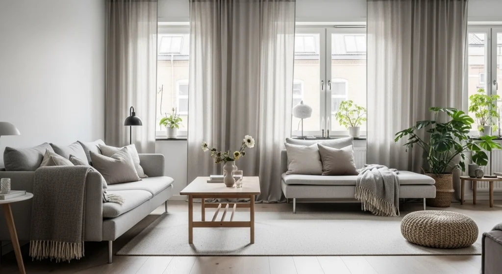 Budget tip: use simple curtain panels and avoid pleats or thick headers. Flat panels feel cleaner and more modern. Neutral shades like off-white, sand, or soft gray work best.
