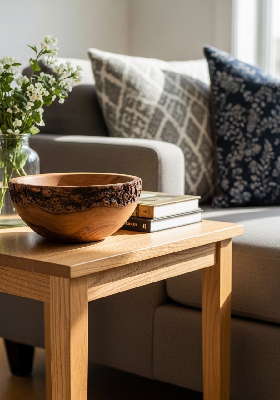 I added a light wood side table and a carved bowl to my minimal living room. The raw grain softened the clean lines and made the space read as collected rather than staged. People notice texture before color.