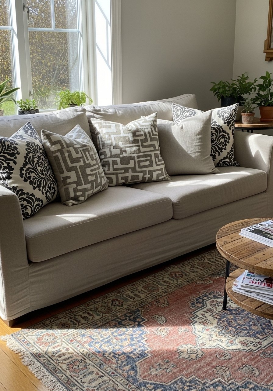 Start with one patterned pillow per seating area, then add neutrals. It’s a small change, big result.