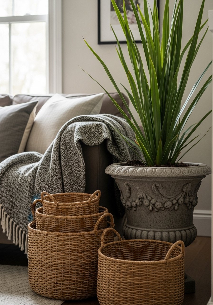 Layer baskets of different sizes and tuck one near seating. It feels effortless and grounded.
