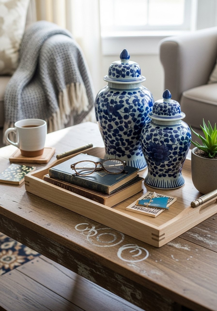 I once clustered too many small pieces and it read busy. Simplicity wins here—two or three pieces with breathing room. The jars dress up a plain console or coffee table fast.