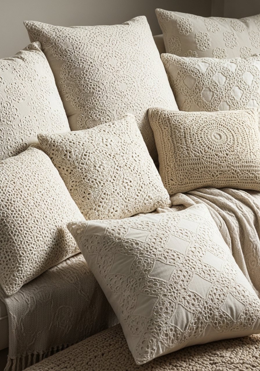 I layered eyelet and crochet pillows for a soft spring feel. The texture reads delicate but survives daily use if you choose sturdy weaves. These pieces soften harder furniture quickly.