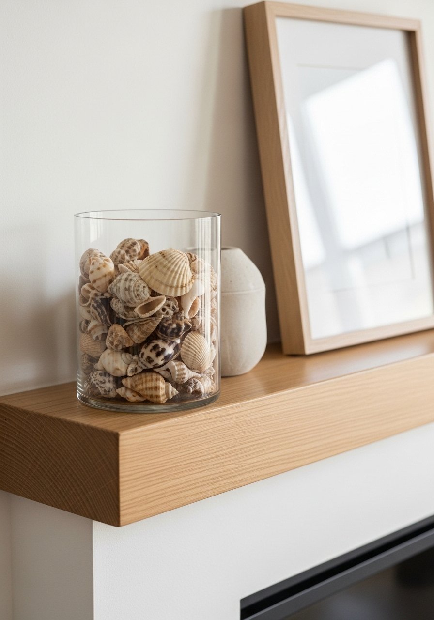 I fill a low glass vessel with collected shells and place it on a shelf. It’s subtle and seasonal without shouting “beach house.” The shells add pale texture and a hint of sand-side light.