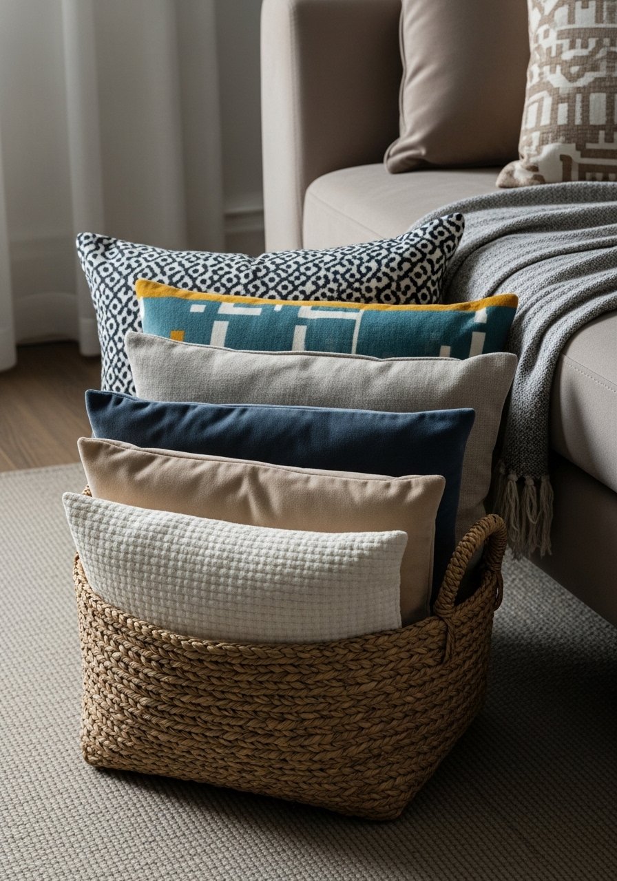 I keep a small basket of seasonally appropriate pillow covers so swaps take minutes. Changing covers refreshes the whole room without reupholstery or heavy lifting.