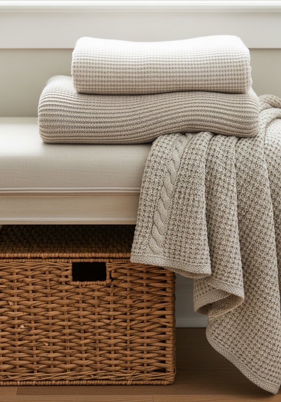 I folded textured throws on a bench near the door. It’s decorative and useful—guests grab one without asking. The visible textiles say “sit down” more effectively than empty seating.