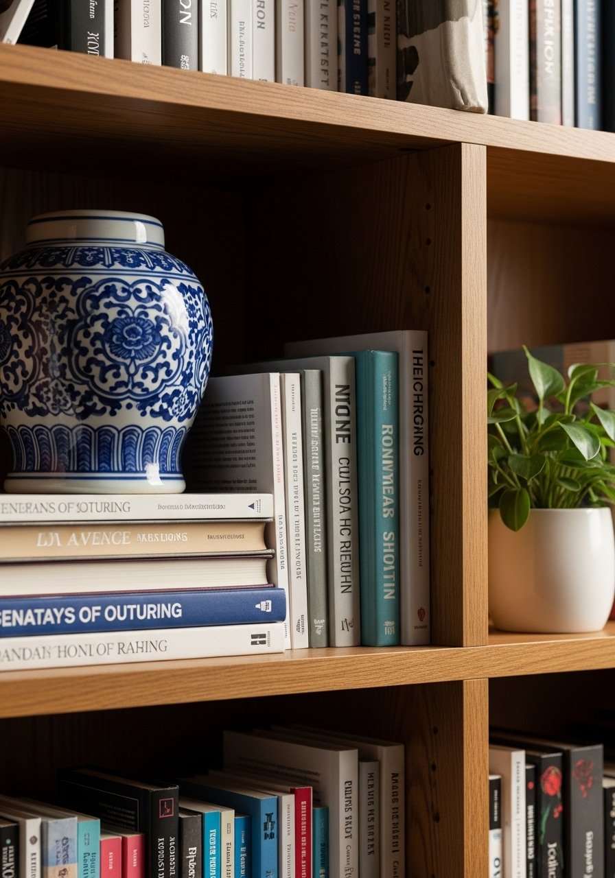 I stopped only using ginger jars on tables and tucked one into a bookshelf. It became a quiet, unexpected detail. The jar’s blue pops next to neutral book spines and woven baskets.