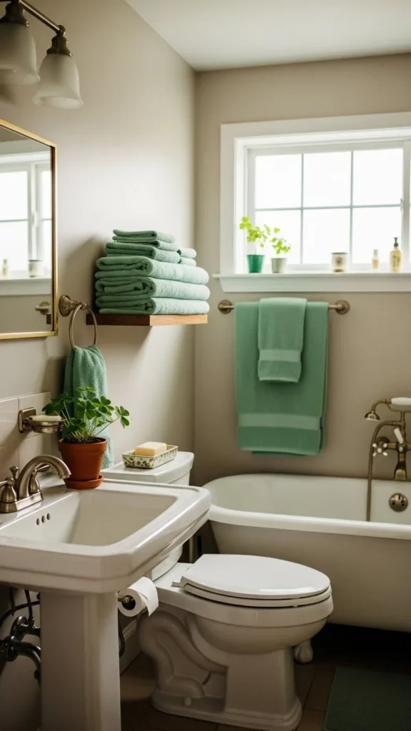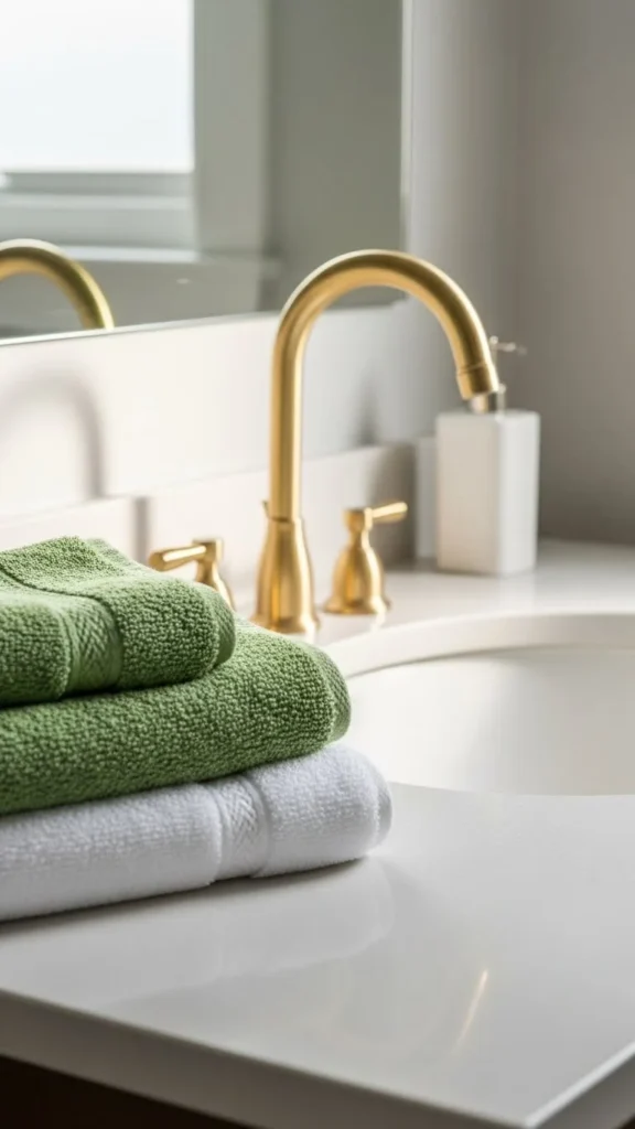 Changing hand towels is one of the quickest ways to add a St Patrick’s Day touch. Choose muted green tones rather than bright shades. Sage, olive, or soft moss works well in most bathrooms. These colors feel calm and easy on the eyes.