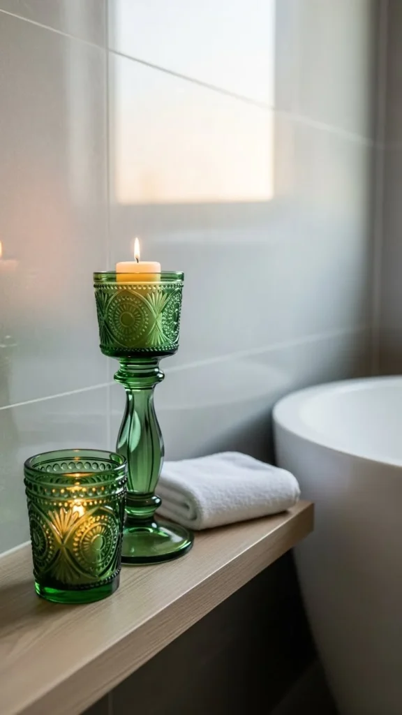 Candle holders add warmth even when not lit. Choose green glass or ceramic styles with simple shapes.