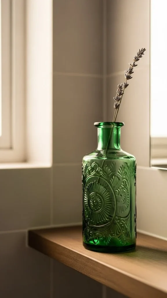 A single green glass bottle adds charm. Place it on a shelf or windowsill.