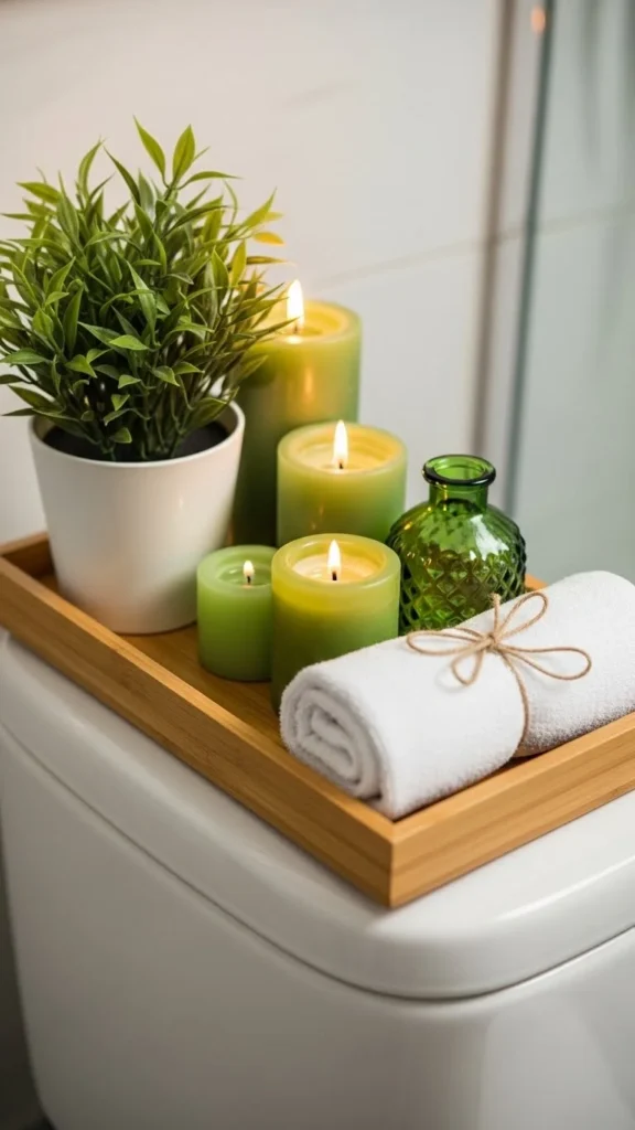 A slim tray on the toilet tank can hold decor neatly. Add a small plant or folded towel.