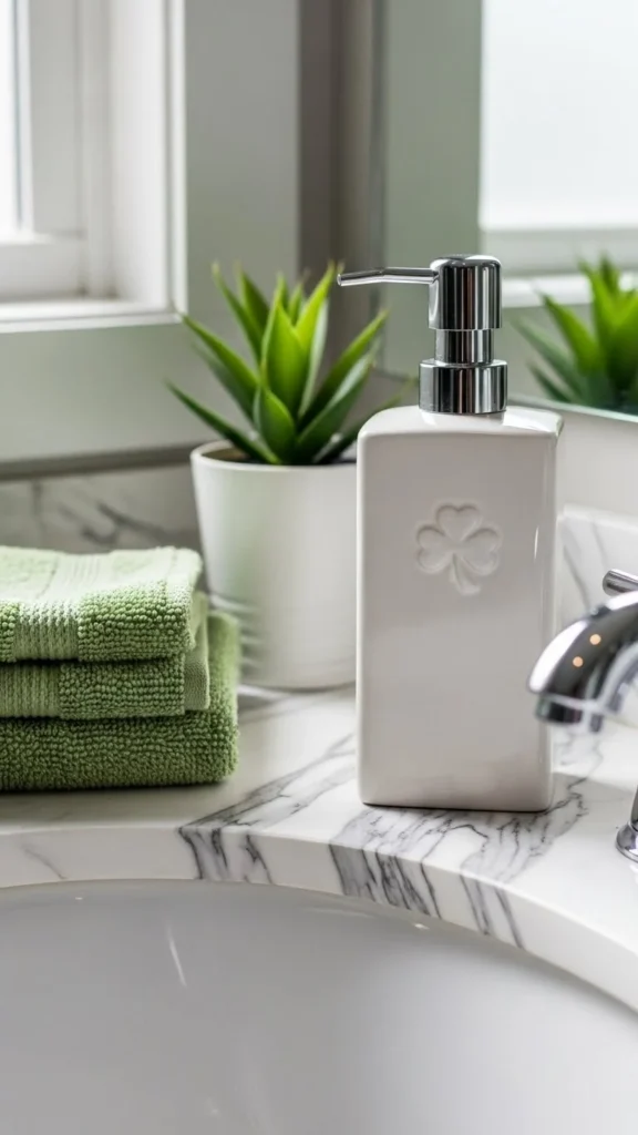 A soap dispenser sits in plain sight, making it a smart place for seasonal style. Look for a simple ceramic or glass dispenser with a clover shape or green tint. Avoid loud patterns.