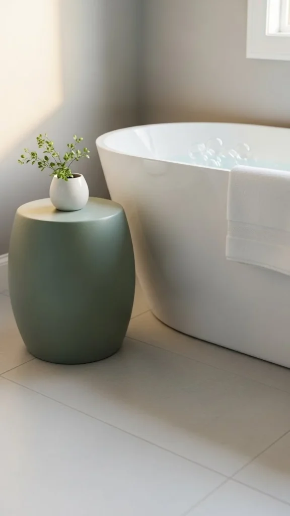 A small stool adds function and style. Use it to hold towels or decor.