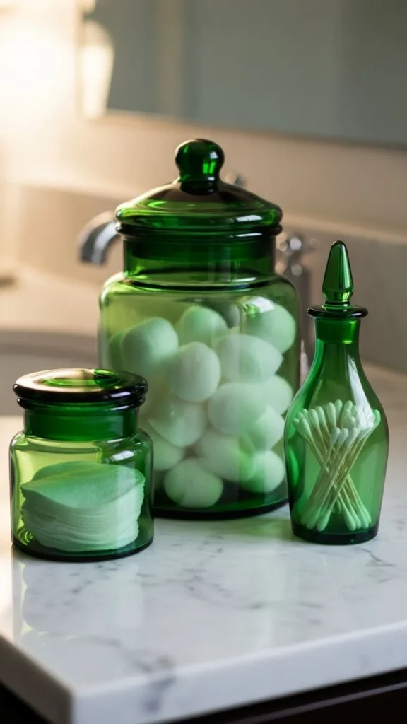 Green glass jars add color and function at the same time. Use them for cotton pads, swabs, or bath salts.