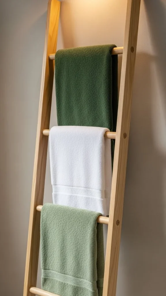 A towel ladder offers storage and style. Drape green and white towels alternately for a subtle seasonal look.