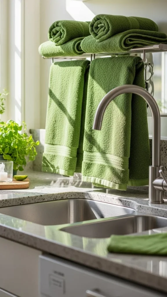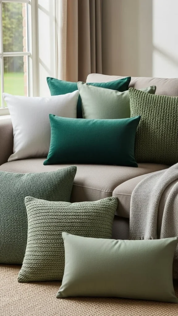 Start with pillows because they are simple to swap. Use two or three green shades rather than one. Mix pale sage with deeper emerald tones. Texture matters more than pattern. Linen, knit, and lightly woven cotton work well together.