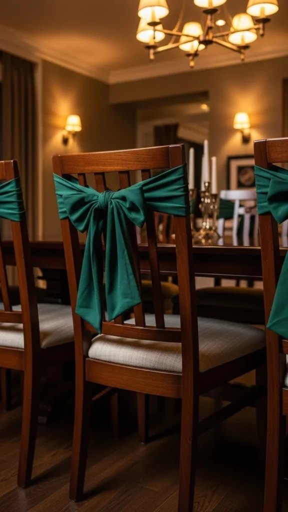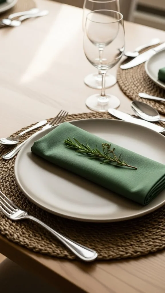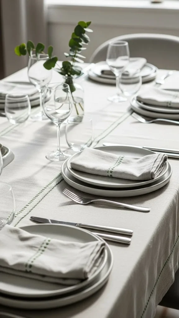 Instead of a bold tablecloth, use a neutral runner. Look for small green stitched edges or patterns. This adds color without overpowering the table.