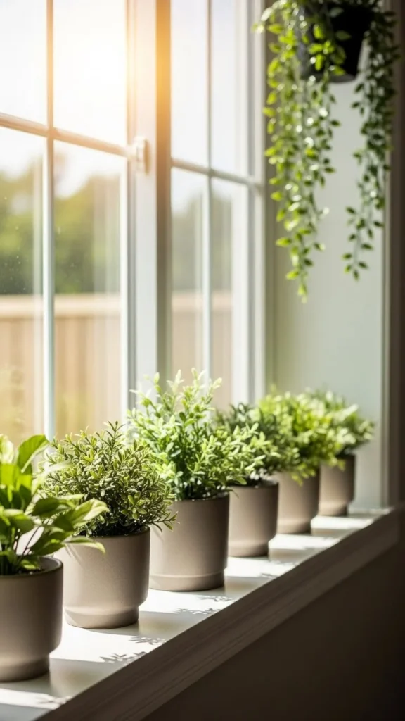 Group small plants along a window sill. Keep pots neutral so the greenery stands out.