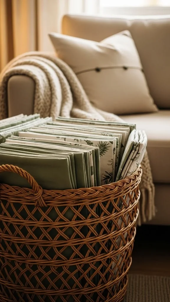 If space allows, slide a basket under the table. This keeps shoes or bags hidden while adding texture.