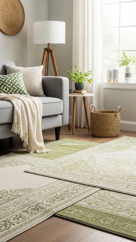 Layer a small green-accent rug over a neutral base. This avoids replacing large rugs.