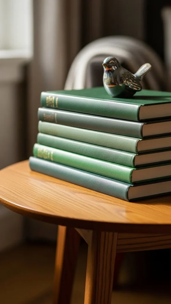 Stack two books to create height. Top them with a small object like a stone or candle holder. Keep items in odd numbers for a relaxed layout.