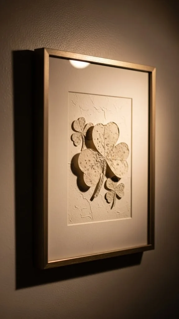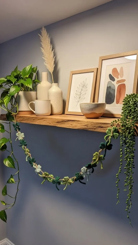 A clover garland adds seasonal charm without filling the room. Use felt, paper, or fabric scraps. Cut simple clover shapes and string them loosely with twine.
