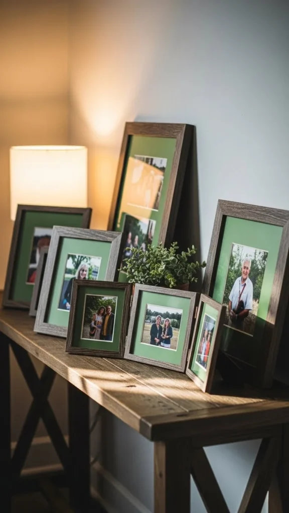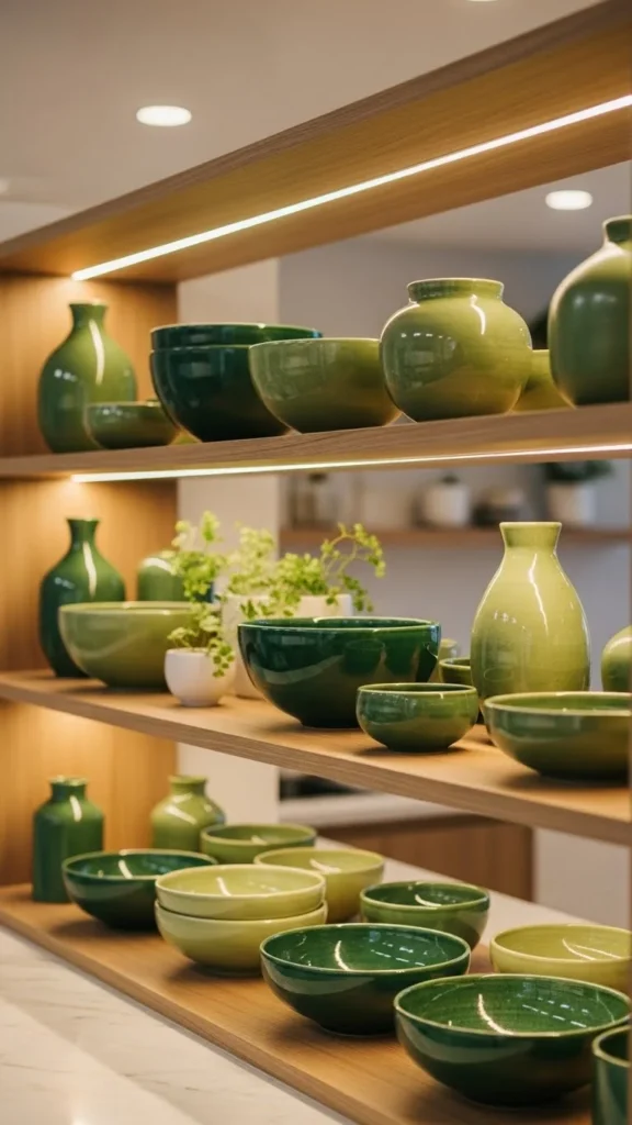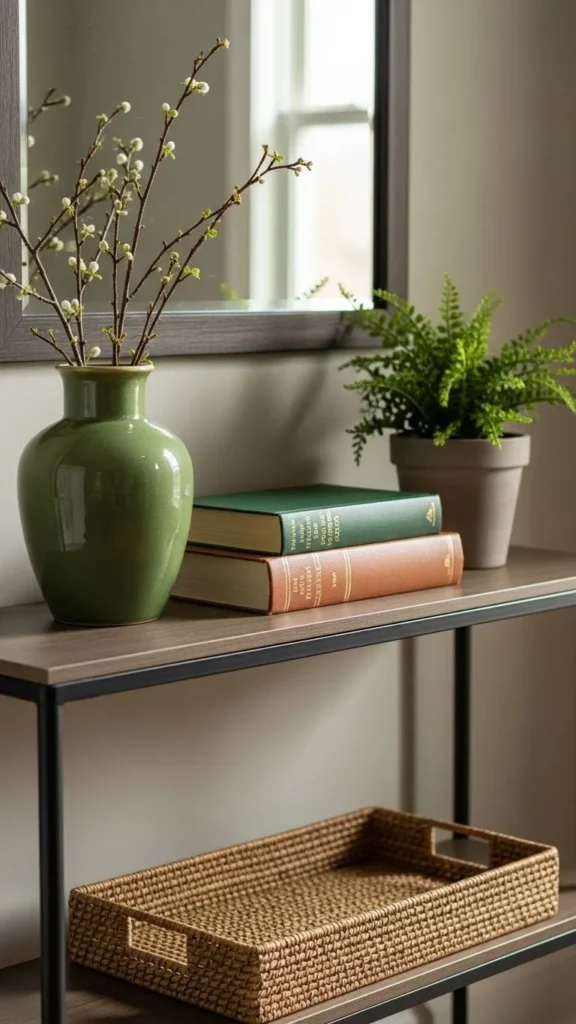 Focus on the first surface guests see. Add a green vase or bowl as the main anchor. Keep the rest simple.